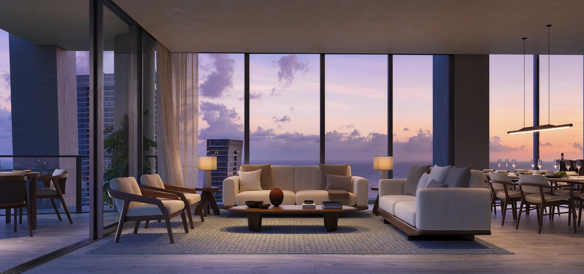 Elevándose en una torre icónica de 76–77 pisos, diseñada por Arquitectonica, Ora ofrece residencias desde estudios hasta unidades de cuatro habitaciones, totalmente amobladas por m2atelier, con acabados italianos, tecnología inteligente y ventanales de piso a techo que inundan cada espacio de luz natural y vistas panorámicas a Brickell, la Bahía de Biscayne y Coconut Grove.